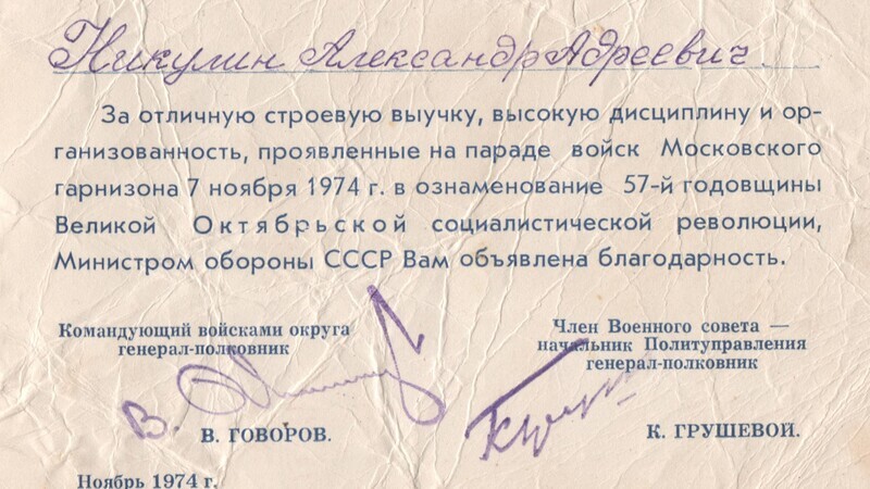 7 ноября 1974 года стало памятным в жизни курсанта Никулина. В этот день ему исполнилось 19 лет, и в этот же самый день он принял участие в параде на Красной площади в Москве, где ему была объявлена благодарность за отличную учёбу и подготовку.