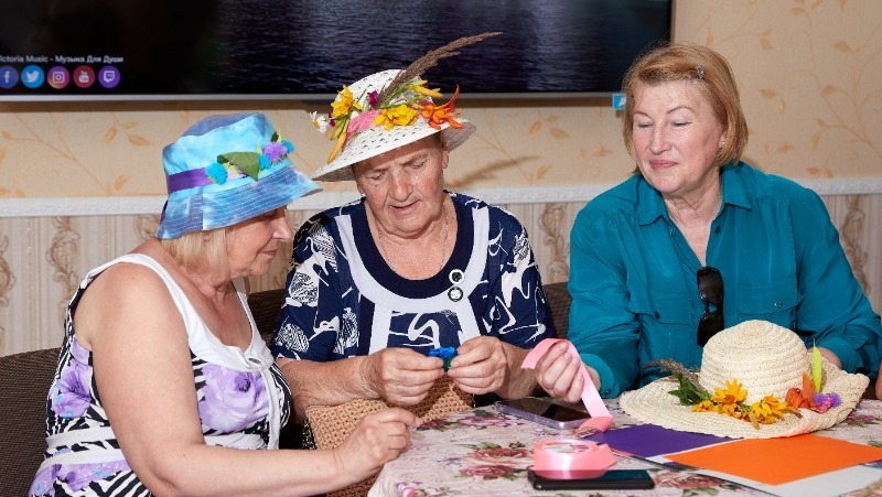 На нынешнем мастер-классе собрались семь пенсионерок. Для совместного фото они примерили только что украшенные своими руками шляпы и панамки. 72-летняя Валентина Кузьминская, красующаяся в летней шляпке с оранжевой лилией, рассказывает, что живёт одна, а отделение с удовольствием посещает, чтобы пообщаться с приятельницами и заняться творчеством.