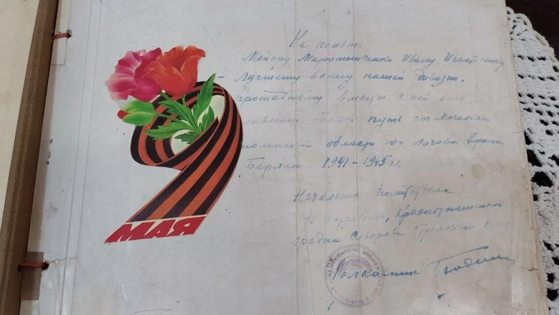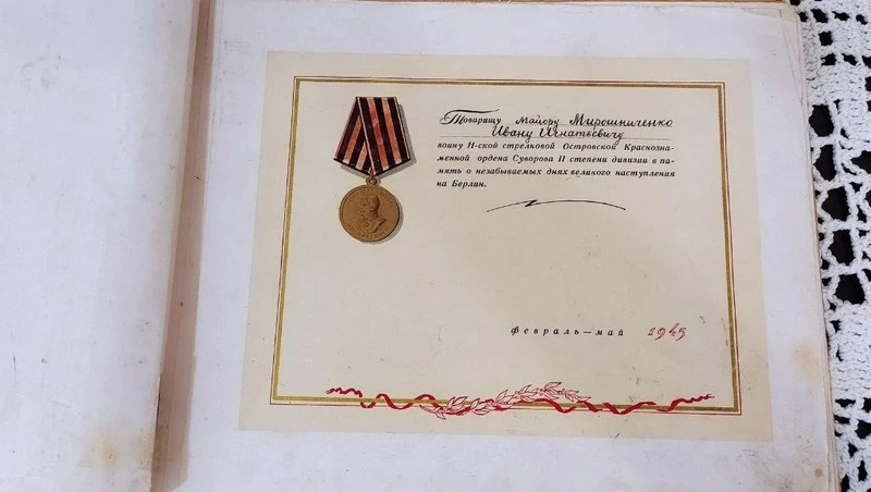 При изучении экспоната мы постарались расширить сведения и о владельце альбома — офицере Мирошниченко. Его биографию осветила в своём исследовании «Жизненный путь майора Советской армии, командира отдельного батальона связи, кавалера ордена Красной Звезды Ивана Игнатьевича Мирошниченко» правнучка героя Дарья Подлесных. При знакомстве с данными в архиве «Память народа», удивил факт, что Мирошниченко родился 12 июля 1910 года. Так, в 1943 году он праздновал свой 33-й день рождения в день танкового сражения на Прохоровке. А уже 24 сентября за образцовое выполнение боевых задач командования на фронте, борьбу с немецкими захватчиками и проявленные при этом доблесть и мужество был награждён орденом Красной Звезды (даты подвига: 13.08.1943 — 05.09.1943). Как и автор альбома, Победу он встретил в Берлине со своими однополчанами. В дарственной надписи начальник Политотдела отметил: «Лучшему воину нашей дивизии, прошедшему вместе с ней весь славный боевой путь… до логова врага».