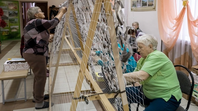 Каждую маскировочную сеть волонтёры подписывают, оставляют тёплые пожелания бойцам, прикрепляют бумажные иконки. Кроме того, женщины вяжут носки, изготавливают белые нашлемники, необходимые зимой, и делают окопные свечи из консервных банок, которые приносят жители.