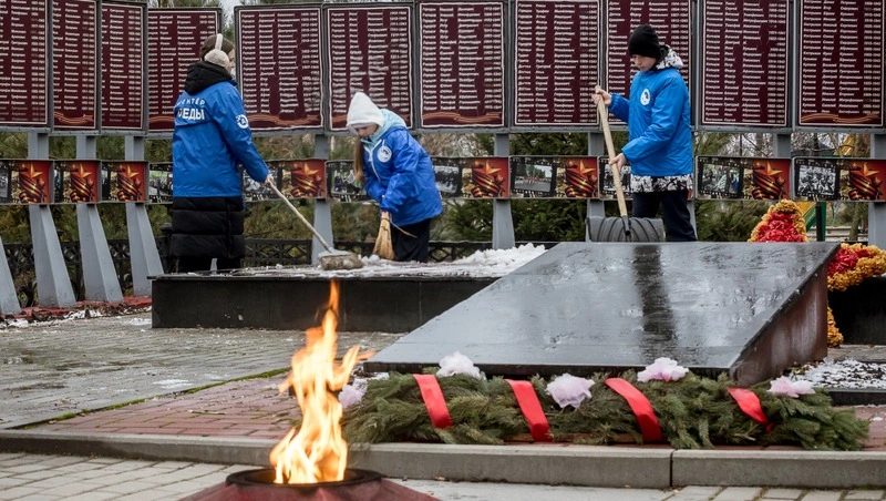 Нас встретила специалист по работе с молодёжью Оксана Никулина. Первым делом мы отправились в сельскую школу, чтобы после уроков забрать юных волонтёров. Они накинули на куртки синие жилетки с надписью «Волонтёры Победы» и направились к Вечному огню в центре села.