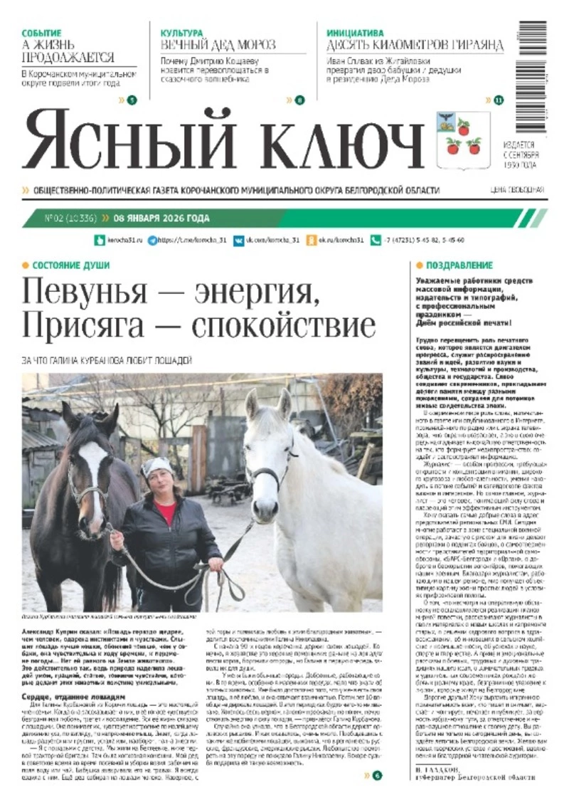 Газета Корочанского округа «Ясный ключ» выходит 1 раз в неделю по четвергам. Адрес редакции: 309210, Белгородская обл., г. Короча, ул. Ленина, 59. Тел: 8 (47231) 5-45-82. E-mail: kor-kl@ya.ru
