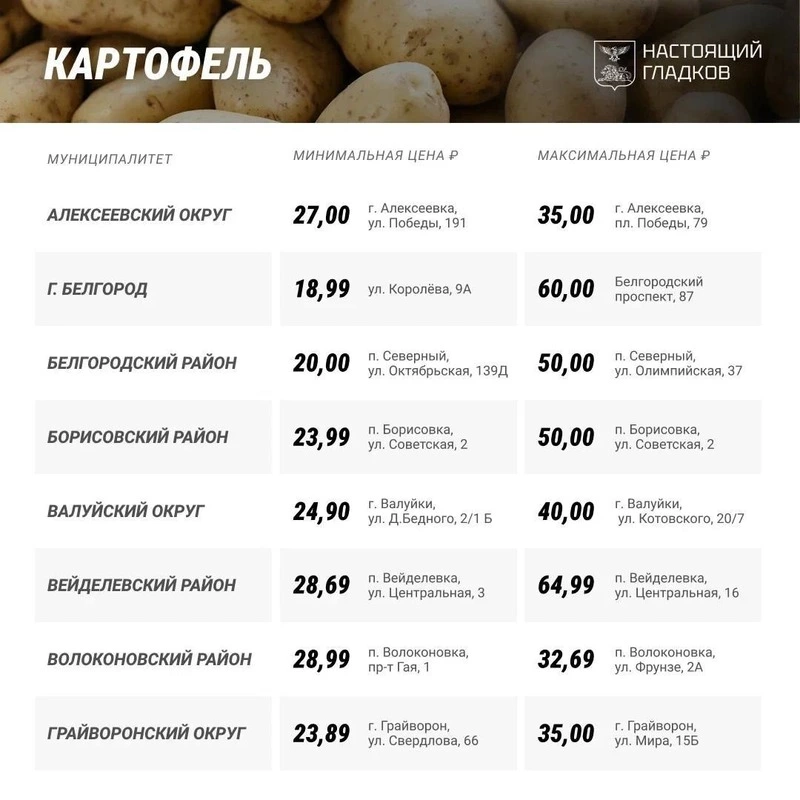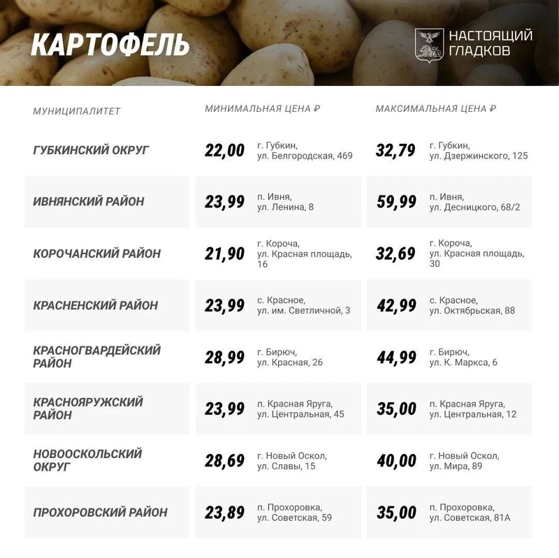 В Корочанском районе минимальная цена за килограмм картофеля 21,90 руб., а максимальная — 32,69 руб. Сколько стоит овощ в других муниципалитетах Белгородской области — в карточках ниже.