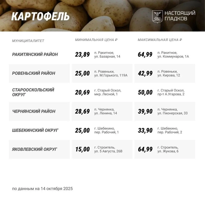 Вячеслав Гладков опубликовал список цен на картофель в Белгородской области. Приобрести килограмм этого овоща по минимальной цене в регионе можно в Яковлевском округе. Там картофель стоит 15 руб.