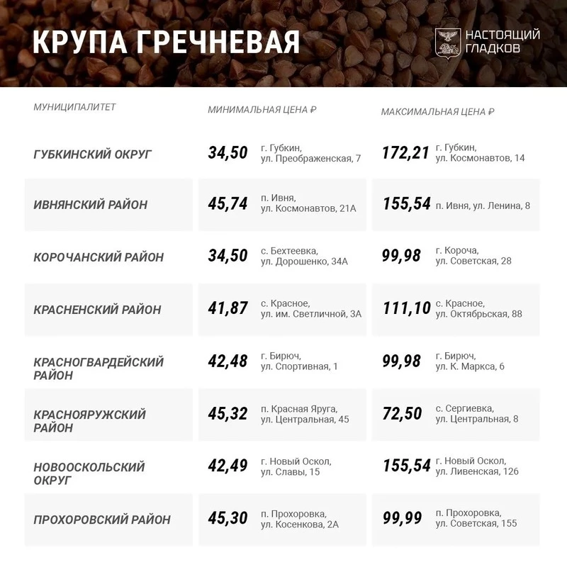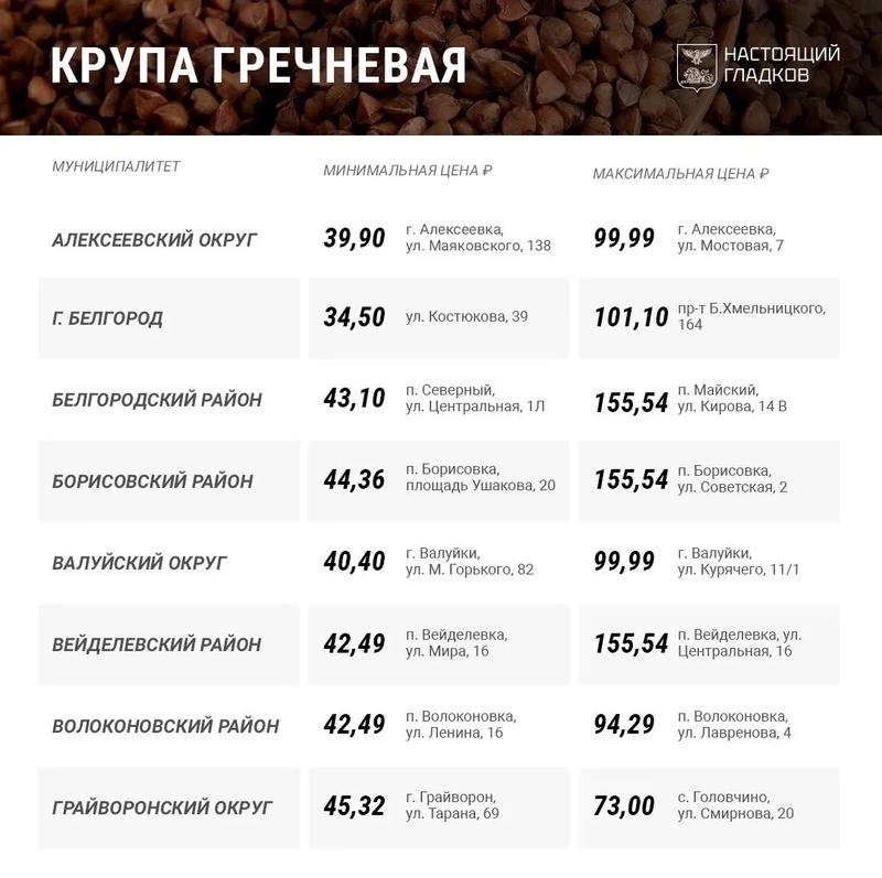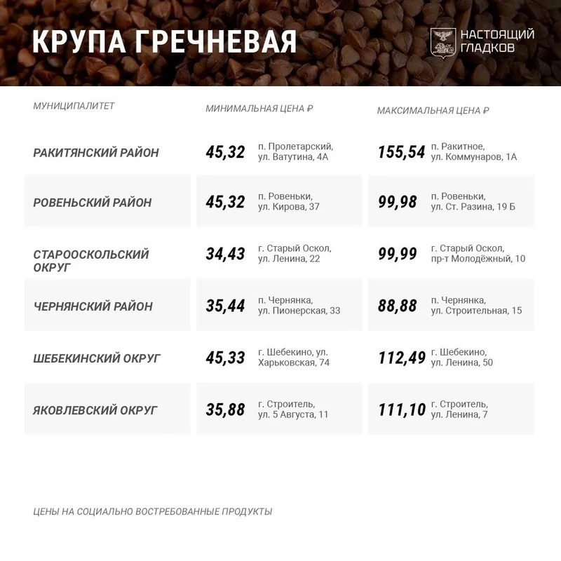 В Корочанском муниципальном округе минимальная цена за килограмм гречневой крупы 34,50 руб., а максимальная — 99,98. Сколько стоит этот продукт в других муниципалитетах Белгородской области — в карточках ниже. Ранее губернатор опубликовал список цена на такие социально востребованные продукты как картофель, капуста белокочанная, лук репчатый.