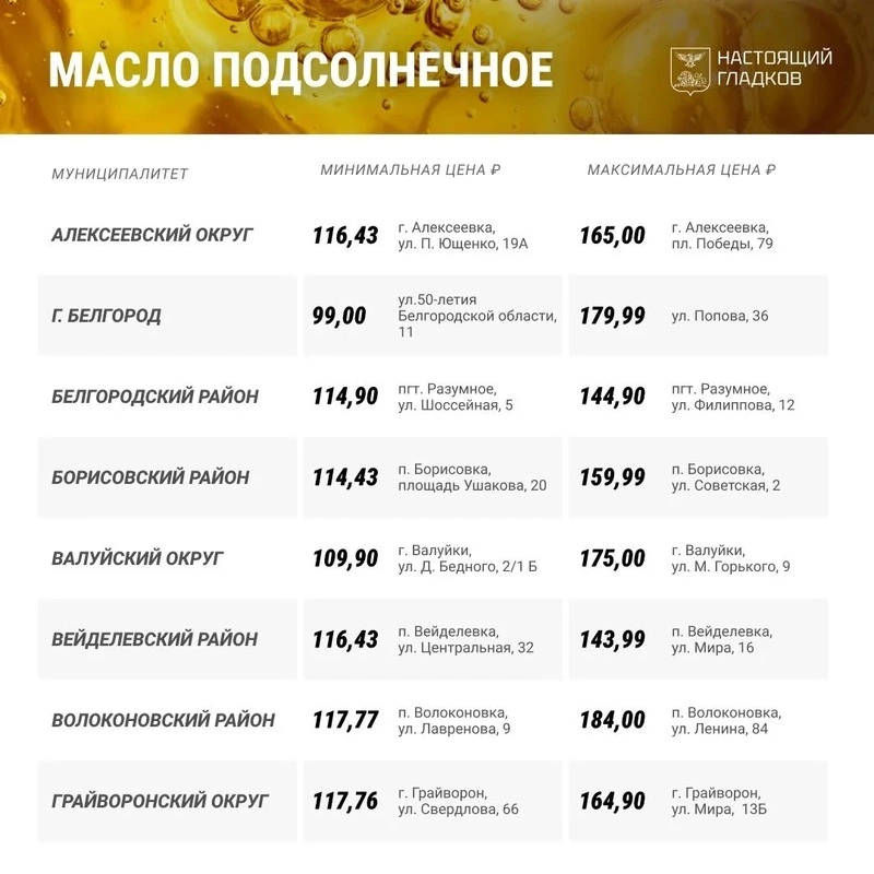 В Корочанском муниципальном округе максимальная цена за литр подсолнечного масла — 177,77 руб. Сколько стоит этот продукт в других муниципалитетах Белгородской области — в карточках ниже. Ранее губернатор опубликовал список цен на такие социально востребованные продукты как картофель, капуста белокочанная, лук репчатый и гречка.