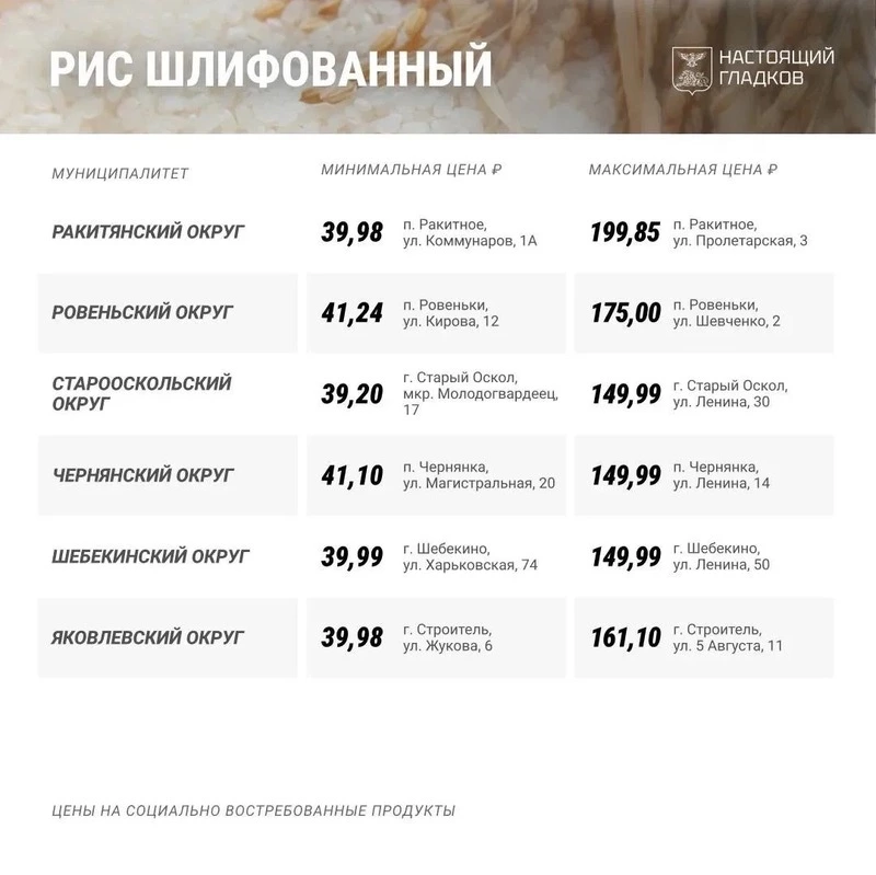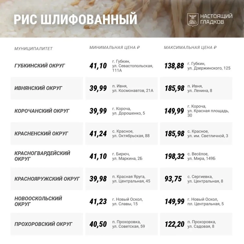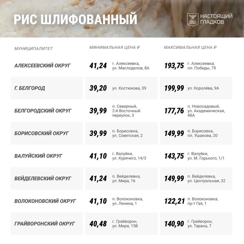 Вячеслав Гладков опубликовал список цен на рис шлифованный круглозёрный в Белгородской области. Приобрести килограмм этого продукта по минимальной цене можно в областном центре и Старооскольским округе — 39,20 руб.