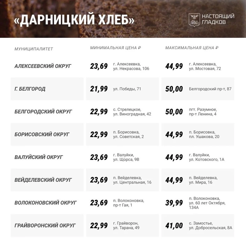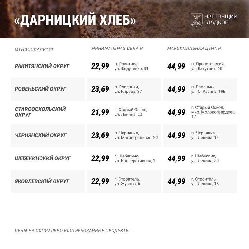 Вячеслав Гладков опубликовал список цен на хлеб в Белгородской области. Приобрести «Дарницкий хлеб» по минимальной цене можно в Белгороде, Корочанском и Старооскольском округах — 21, 99 руб. Самый дорогой хлеб в областном центре и Белгородском округе — 50 руб.