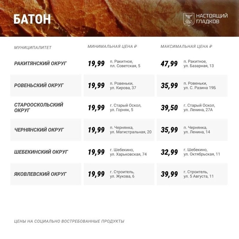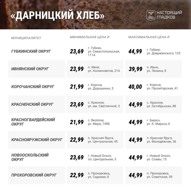 В Корочанском округе минимальная цена на «Дарницкий хлеб» 21,99 руб., а максимальная — 40 руб. Батон в округе стоит от 19,99 руб. до 33,99 руб.