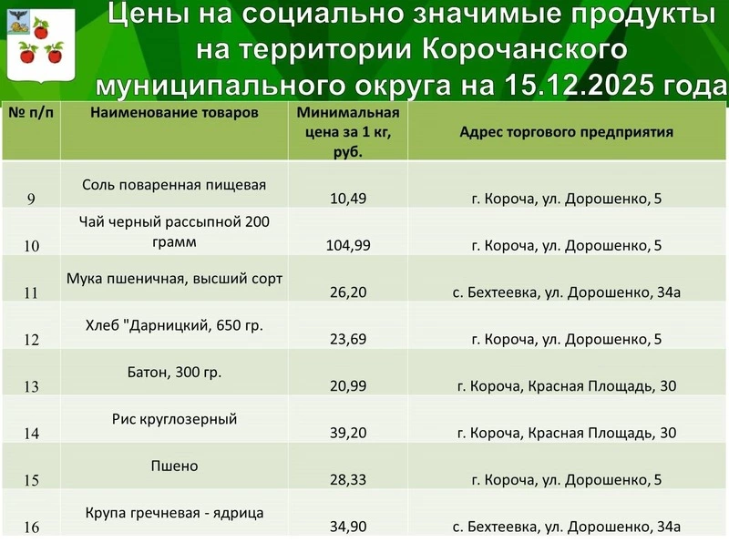 Николай Нестеров поделился подборкой цен на социально значимые продукты в Корочанском округе. Стоимость продуктов питания указана по состоянию на 15 декабря 2025 года.
