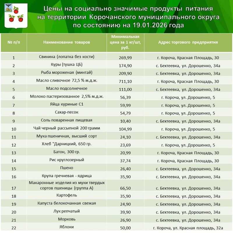 Николай Нестеров поделился подборкой цен на социально значимые продукты в Корочанском округе. Стоимость продуктов питания указана по состоянию на 19 января 2026 года.