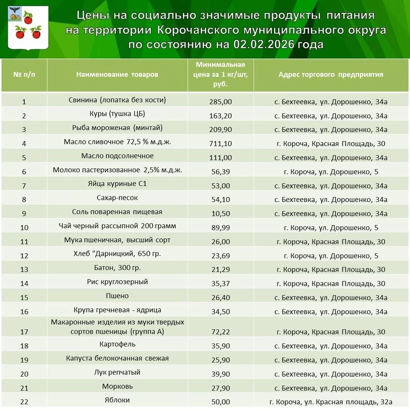 Николай Нестеров поделился подборкой цен на социально значимые продукты в Корочанском округе. Стоимость продуктов питания указана по состоянию на 2 февраля 2026 года.