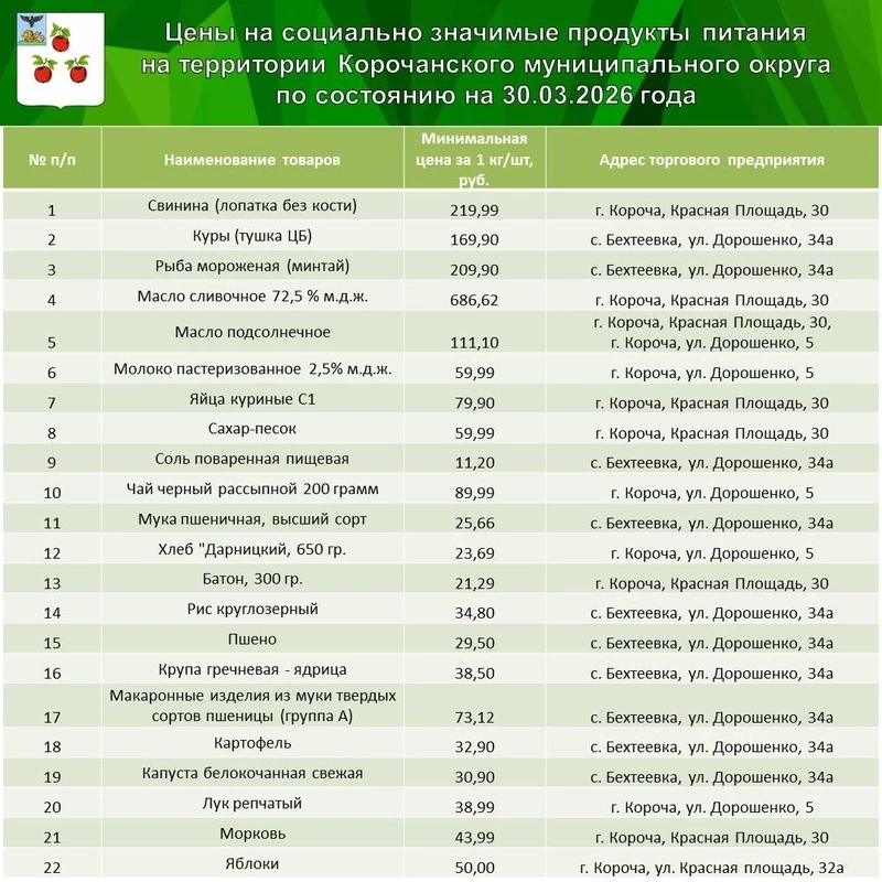 Николай Нестеров поделился подборкой цен на социально значимые продукты в Корочанском округе. Стоимость продуктов питания указана по состоянию на 30 марта 2026 года.