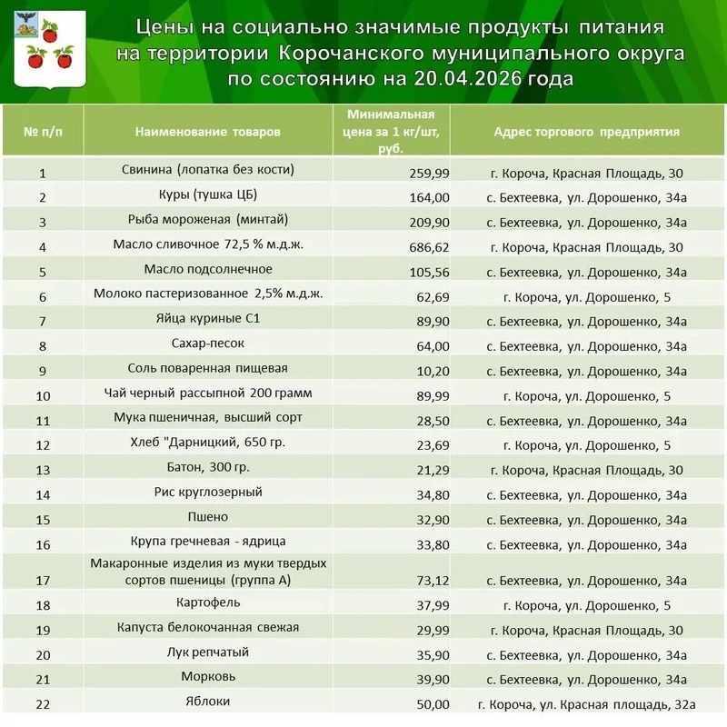 Николай Нестеров поделился подборкой цен на социально значимые продукты в Корочанском округе. Стоимость продуктов питания указана по состоянию на 20 апреля 2026 года.